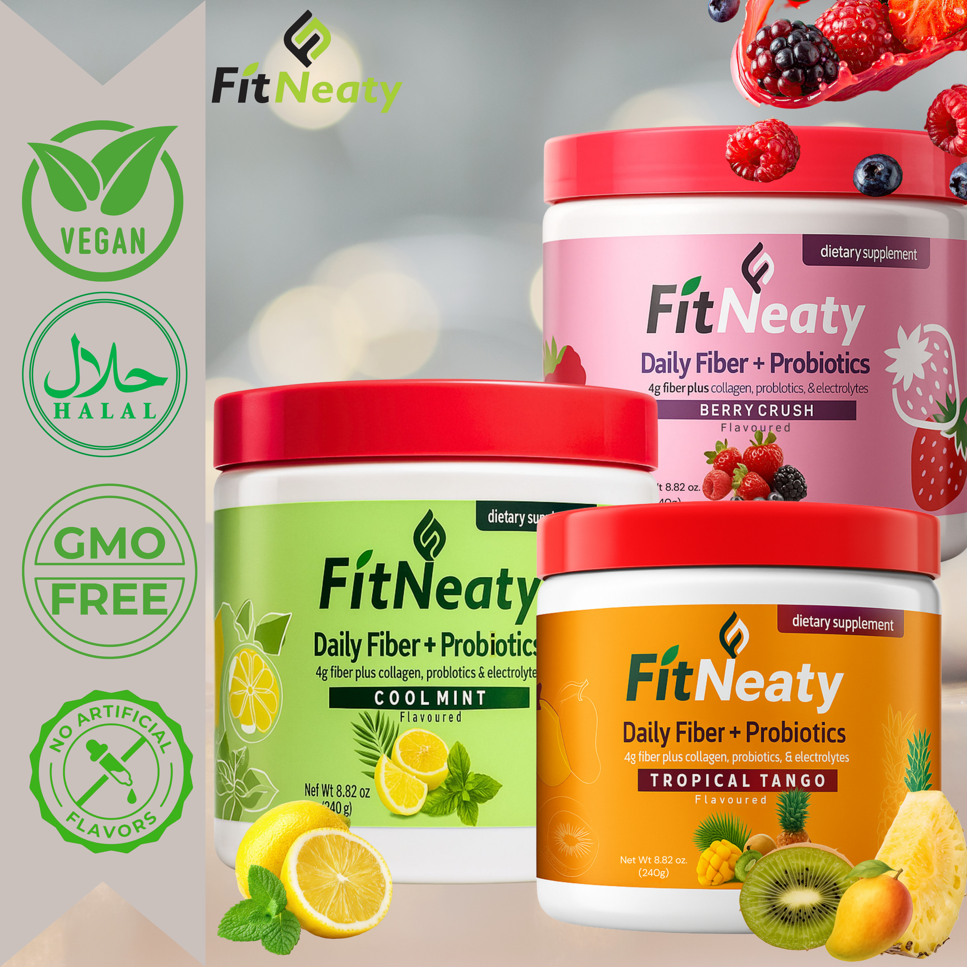 FitNeaty was founded with a deep passion for holistic wellness and balanced living. We noticed that many people struggle to get the nutrients their bodies truly need, so we created a line of supplements combining fiber, collagen, probiotics, and electrolytes — all in one convenient, delicious formula.